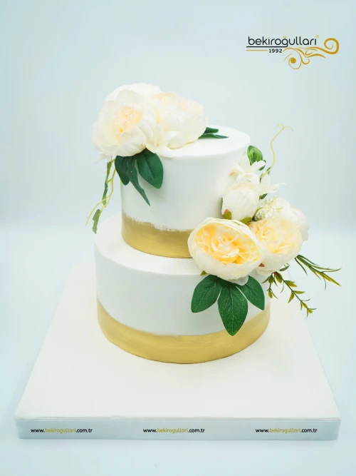 Beyaz Çiçek Ve Gold Detay Tasarım Pasta